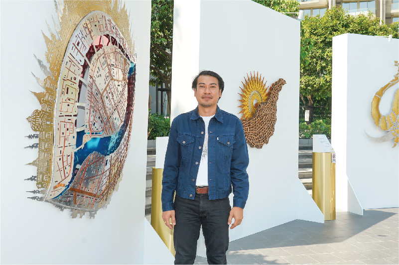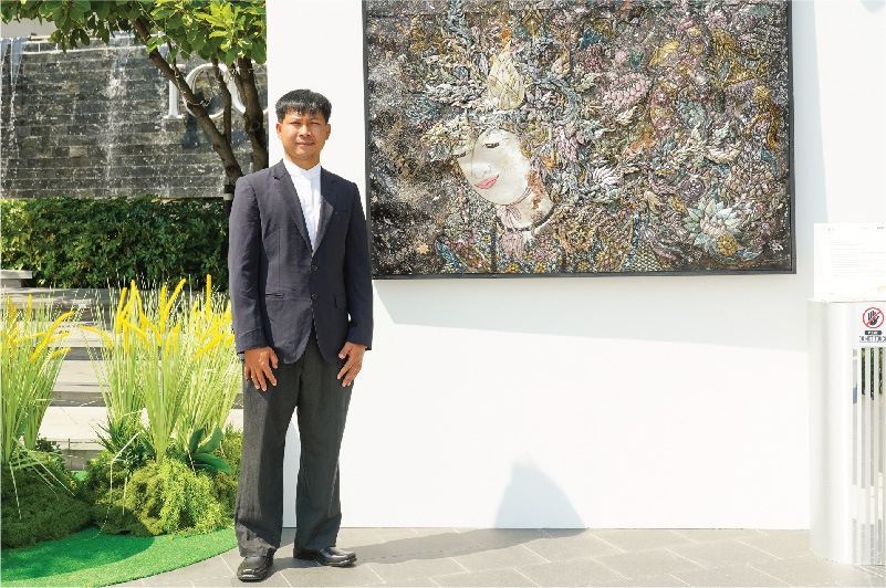 ผลงานชิ้นแรก คชสารแห่งสุวรรณภูมิ ถ่ายทอดรอยจารึกแห่งอารยธรรมบนแผ่นดินสุวรรณภูมิ ผสานเข้ากับสรีระของคชสาร โดยตัดทอนรูปทรงให้เรียบง่ายแต่ทรงพลัง ผลงานชิ้นที่สอง เบิกบาน ถ่ายทอดสภาวะแห่งความสุข และความรื่นรมย์ที่เติบโตท่ามกลางความเจริญของเมืองใหญ่ ใช้ไม้และงานฉลุ ผนวกกับการประกอบในหลายมิติ เปิดพื้นที่ให้แสงและเงาไหลผ่าน ผลงานชิ้นที่สาม ทศพิธราชธรรม แรงบันดาลใจจาก หลักธรรมแห่งผู้ปกครอง สะท้อนความงดงามของการใช้อำนาจอย่างมีคุณธรรม ผ่านโครงสร้างโลหะ และการฉลุลายอันประณีตบนสแตนเลส อะลูมิเนียม และทองแดง เปรียบเสมือนการบ่มเพาะความดีงามผ่านความมั่นคงและความเพียร