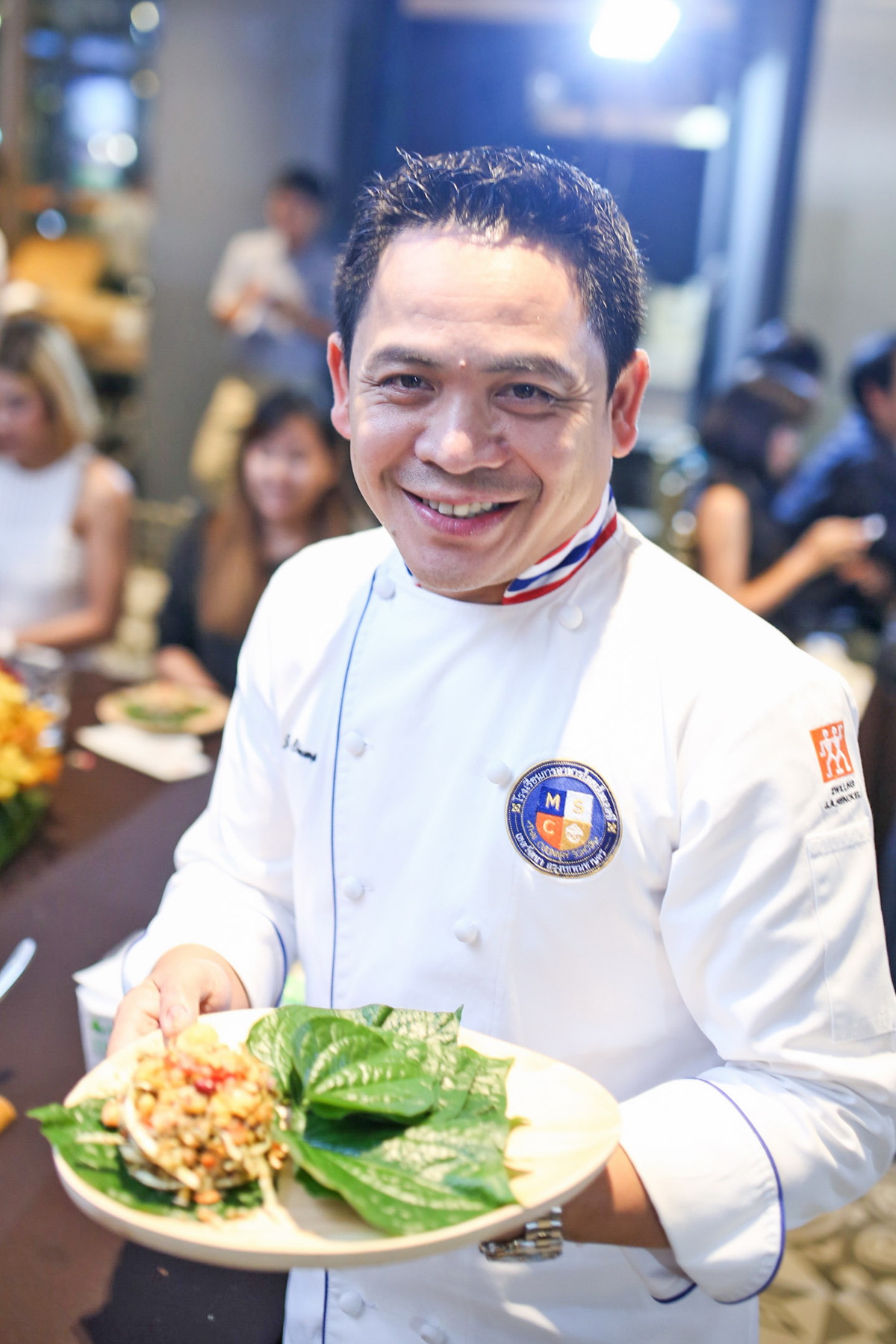 เชฟชุมพล แจ้งไพร สุดยอดเชฟอาหารไทย กล่าวว่า เมนูที่เลือกมาในวันนี้คือ หล่าเพ็ด ที่มีรสชาติครบรส ทั้งรสเปรี้ยว เผ็ดนำ ตามด้วยเค็ม และหวานปลาย คล้ายรสยำ โดยใช้ใบชาและธัญพืชจากแถบอาเซียน อย่าง พริก หอมแดง มะนาว งาคั่ว ถั่วลิสง กะหล่ำปลี เป็นต้น คลุกเคล้าให้เข้ากัน โดยจับคู่กับเครื่องดื่มแพริ่ง Mekhong Thai Sabai ค็อกเทลที่มาคู่กัน จึงไม่ควรมีรสจัดจนเกินไป เพราะอาจทำให้ความอยากอาหารจานต่อไปลดลง “แม่โขงไทยสบาย” ที่รสชาติไม่เข้มจนเกินไป ให้ความรู้สึกสดชื่น มีกลิ่นหอม มีส่วนผสมของแม่โขง น้ำมะนาว และใบโหระพา มีส่วนช่วยเพิ่มความเจริญอาหาร และให้กับ หล่าเพ็ดได้เป็นอย่างดี