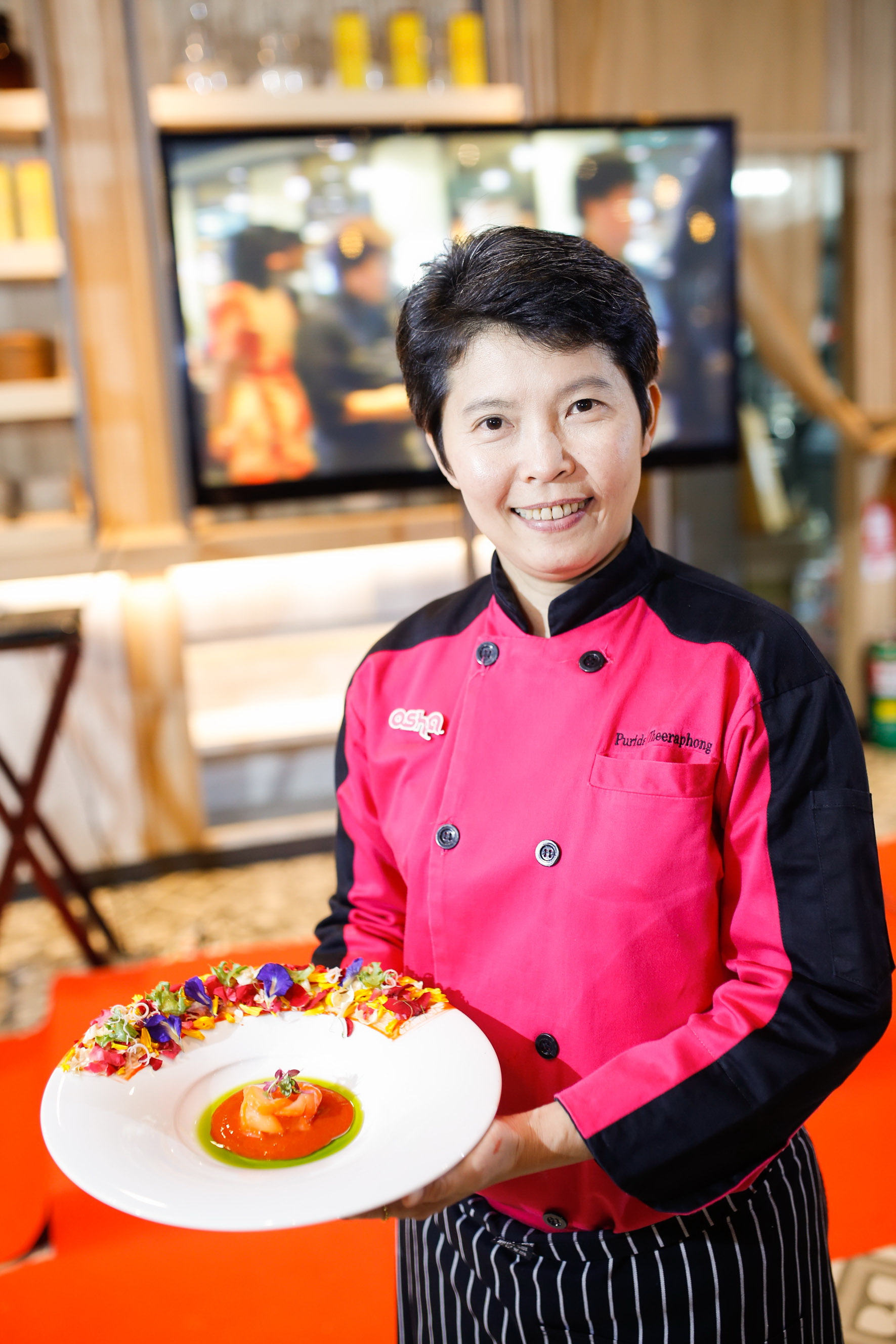 ด้าน เชฟปริดา ธีระพงษ์ Executive Chef จากร้าน Osha Thai Restaurant & Bar กล่าวว่า “เลือกเมนู Osha Ocean & Floral Salad(ยำหอยเชลล์น้ำฟักข้าว) สีสันจี้ดจ๊าด ที่ผสมน้ำยำรสจัดจ้านกับน้ำฟักข้าว ราดด้วยน้ำมันผักชีกลิ่นหอมละมุน โดยรสชาติไปกันได้ดีกับหอยเชลล์สดๆที่มีความหวานและนุ่ม โรยด้วย กุหลาบ,อัญชัน,ดาวเรือง,ตะไคร้,มะกรูดฝอย โดยเชฟจะเสิร์ฟแบบแยกวัตถุดิบ แต่เวลารับประทานจะคล้ายการทานสลัดที่ให้รสชาติไทยแท้ๆ โดยนำมาจับคู่กับเครื่องดื่มแพริ่ง Mekhong Hanuman “แม่โขงหนุมาน” ที่มีส่วนผสมของน้ำมะพร้าวและสมุนไพร ที่มีความหอมหวานกลมกล่อมตัดกับความเผ็ด และช่วยเสริมให้รสชาติอาหารโดดเด่น ทานอาหารได้ง่ายขึ้น เพิ่มอรรถรสในทุกคำของอาหาร”