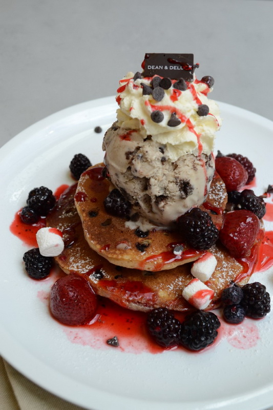เริ่มต้นด้วยเมนูหวานซ่อนเปรี้ยว Strawberry Fields แพนเค้กเนื้อเรดเวลเวทสีแดงฉ่ำเสิร์ฟคู่กับไอศกรีมสตรอว์เบอร์รี่ และมาร์ชเมลโลว (325 บาท) สำหรับคนไม่ชอบรสหวานจัด ตัดรสหวานกันสักนิดด้วยแพนเค้กชาเขียว กับเมนูชื่อ Green Day เคียงคู่มาด้วยไอศกรีมรส Salted Caramel หวานผสานเค็มนิดๆ ทานคู่กับผลไม้ ราดซอสคาราเมล ราคา 285 บาท
