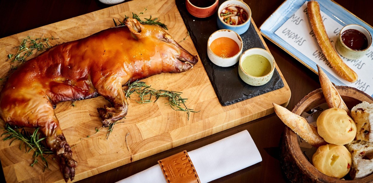 บินลัดฟ้าสู่ทะเลเมดิเตอร์เรเนียน กับอาหารสเปนต้นตำรับจากเมืองเซโกเบีย เริ่มต้นมื้อหรูด้วยขนมปังที่อบสดใหม่ทุกวัน รับประกันความหอมกรุ่นจากเตา ตามด้วยเมนูเด็ด “Spanish Cochinillo Asado” หมูย่างแบบสเปนแท้ๆ ปรุงด้วยเทคนิคสูตรลับเฉพาะที่ส่งต่อกันมานับศตวรรษ ทำให้ได้เนื้อหมูฉ่ำนุ่มแบบละลายในปาก และหนังบางกรอบรสชาติหวานหอม ทานคู่กับดิปที่มีให้เลือกหลากรสชาติ ทั้งเกรวี่ ซอสเผ็ดแบบสเปน และน้ำจิ้มแจ่ว และที่ขาดไม่ได้ก็คือ ชูโรส ปาท่องโก๋ชิ้นยาว เสิร์ฟพร้อมซอสช็อกโกแลตรสเข้มข้น เรียกว่าได้สัมผัสบรรยากาศแบบสเปนจากใจกลางกรุงเทพฯ เลยทีเดียว