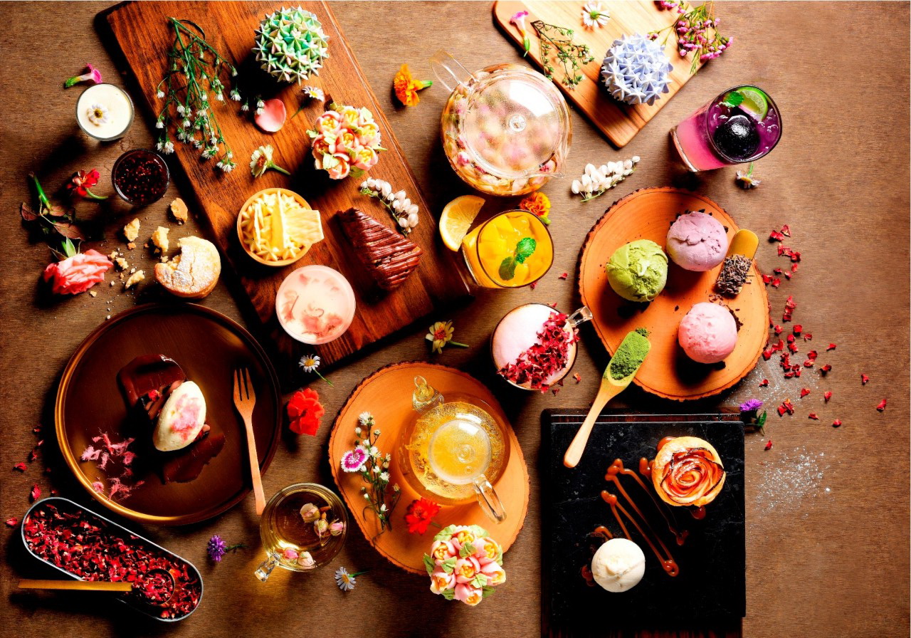 เริ่มกันที่ “Floral High Tea” รวบรวมของหวานที่ทำจากดอกไม้หลากหลายเมนูไว้ในเซตเดียว อาทิ Dark Chocolate Scone สโคนดาร์คช็อกโกแล็ตผสมช็อกโกแล็ตคุณภาพเยี่ยมจากประเทศเวเนซูเอล่า ให้รสชาติที่เข้มข้น หวานน้อย, Sakura Milk Pudding พุดดิ้งนมสดเนื้อนุ่มละมุนลิ้น รับประทานพร้อมกับเจลลี่กลิ่นดอกซากุระสีหวาน, Honey Yuzu Tartlet ทาร์ตส้มยูซุรสชาติหวานอมเปรี้ยว เสริฟพร้อมกับครีมน้ำผึ้งดิโพลแม็ท ตกแต่งด้วยไวท์ช็อกโกแลต เข้ากันเป็นที่สุด หรือ Raspberry & Rose Homemade Jam โฮมเมดแยมที่ทำสดใหม่สำหรับงานดอกไม้ประจำปีนี้ โดยแยมราสเบอร์รี่มีส่วนผสมของกลีบกุหลาบออร์แกนิก ทำให้มีความหวาน อมเปรี้ยว ได้กลิ่นของดอกกุหลาบในทุกๆ คำที่รับประทาน