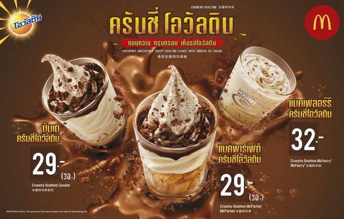 ของหวานเมนูใหม่ก็มา ไอศกรีมที่กล้าคอนเฟิร์มว่าอร่อยมากกับ ‘ครันชี่ โอวัลติน’ หอม หวานกำลังดี กรุบกรอบ เต็มรสโอวัลตินเข้มข้นทั้ง ซันเด ครั้นชี่ โอวัลติน’ ไอศกรีมซอฟเสิร์ฟราดช็อกโกแลตฮอทฟัดจ์ ท้อปด้วยโอวัลติน เฟล็ค, ‘แมคพาร์เฟ่ต์ ครั้นชี่ โอวัลติน’ เพิ่มเนื้อสัมผัสด้วยครูตองซ์ (Croutons) ขนมปังกรอบสไตล์ฝรั่งเศส หรูหราราคาไม่แรงเพียง 29 บาท และ ‘แมคเฟลอร์รี่ ครั้นชี่ โอวัลติน’ การผสมผสานอย่างลงตัวของไอศกรีมเนื้อเนียนกับโอวัลติน เฟล็คและครั้นช์โคน อร่อย เคี้ยวเพลิน ในราคาเพียง 32 บาท