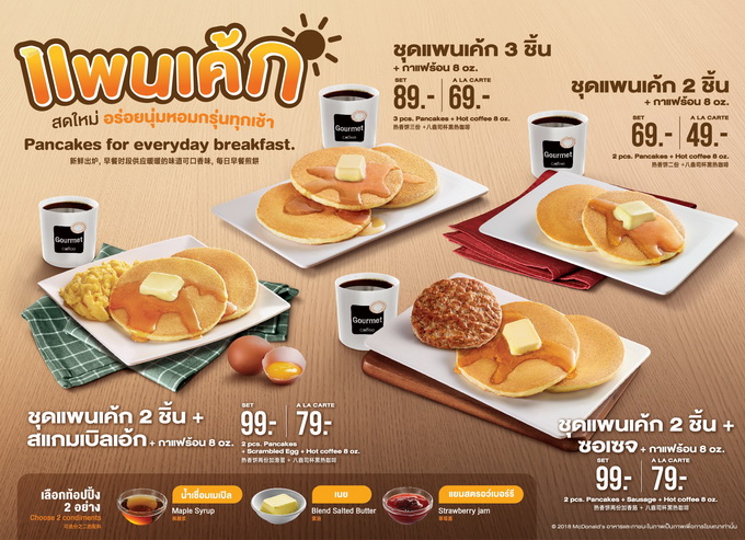 แมคโดนัลด์  แนะนำอาหารเช้าเมนูใหม่ล่าสุด เสิร์ฟร้อน หอมกรุ่นกับเมนู ‘แพนเค้ก’ สูตรเฉพาะของแมคโดนัลด์ อร่อยคุ้มกับ ชุดแพนเค้ก 2 ชิ้น ราคาเพียง 49 บาท และ ชุดแพนเค้ก 3 ชิ้น ราคาเพียง 69 บาท หรืออิ่มจัดเต็มกับชุดแพนเค้ก 2 ชิ้น พร้อมซอเซจ และชุดแพนเค้ก 2 ชิ้น พร้อมสแกมเบิลเอ้ก ราคาเบาๆ เพียง 79 บาท หรือจะเลือกฟินยกเซตพร้อมกาแฟสดหอมกรุ่น เพิ่มเพียง 20 บาทก็ได้ดื่มด่ำกับเครื่องดื่มลองแบล็คร้อน ขนาด 8 ออนซ์ นอกจากนี้ในทุกเมนูแพนเค้กยังเสิร์ฟพร้อมท้อปปิ้งเลือกได้ 2 อย่าง ไม่ว่าจะเป็น เนย, น้ำเชื่อมเมเปิ้ล หรือแยมสตรอว์เบอร์รี่ ก็อิ่ม อร่อย พร้อมรับวันใหม่ได้ทุกวัน