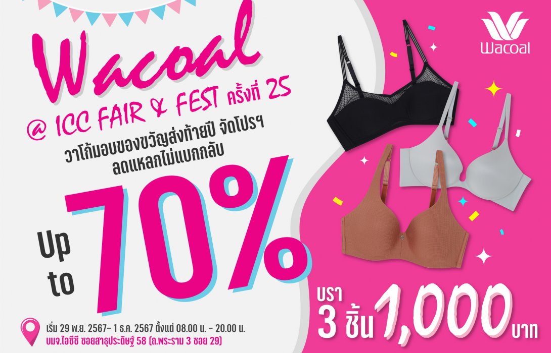 "วาโก้" มอบของขวัญส่งท้ายปี จัดโปรฯ ลดแหลกไม่แบกกลับ สูงสุด 70% หรือบรา 3 ชิ้น 1,000.- กางเกงใน 5 ชิ้น 350.- ในงาน ICC FAIR & FEST เริ่ม 29 พ.ย.- 1 ธ.ค. 67
