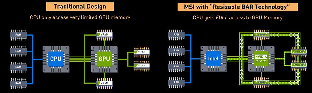 สิ่งที่ทำให้เกมมิ่งโน้ตบุ๊กของ MSI รุ่นใหม่ที่ใช้ขุมพลัง GeForce RTX™ 30 ซีรี่ส์ เป็นเกมมิ่งโน้ตบุ๊กที่ดึงประสิทธิภาพในการเล่นเกมออกมาได้อย่างสูงสุดนั้น นั่นเพราะมีการใช้เทคโนโลยีใหม่ Resizable BAR ที่เกิดจากการร่วมมือกันระหว่าง NVIDIA และ Intel ซึ่งที่ผ่านมานั้น สถาปัตยกรรมของ CPU จะถูกจำกัดการเข้าถึงหน่วยความจำของ GPU อยู่พอสมควร โดยมีการจำกัดความเร็วในการโอนถ่ายข้อมูลไว้ที่ 256MB เท่านั้น แต่ในขณะที่เกมยุคใหม่ มีการแสดงผลในระดับที่สูงขึ้นมากกว่าที่ผ่านมา รวมถึงสามารถแสดงผลได้อย่างสมจริงด้วยด้วยรายละเอียดที่ชัดเจนยิ่งกว่าเดิม แต่สถาปัตยกรรมแบบเดิมนั้น ไม่สามารถรองรับการโอนถ่ายข้อมูลที่มีขนาดใหญ่พอที่จะรองรับในการเล่นเกมได้อีกต่อไป เพราะต้องมีการใช้ข้อมูลเกี่ยวกับพื้นผิวและรูปทรงทางคณิตศาสตร์เป็นจำนวนมากส่งผ่านระหว่าง CPU ไปสู่ VRAM และเมื่อการโอนถ่ายข้อมูลถึงขีดจำกัด ก็จะเกิดการติดขัดและทำให้ต้องจัดลำดับในการโอนถ่ายข้อมูลใหม่ ทำให้ไม่สามารถใช้ประสิทธิภาพของการทำงานได้อย่างเต็มที่