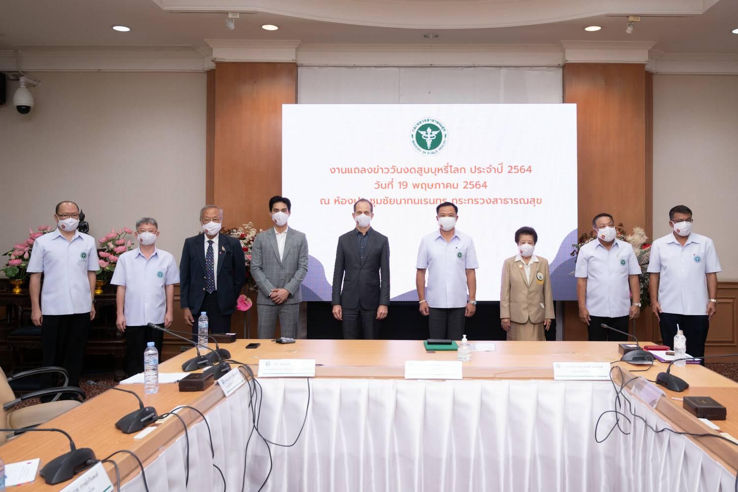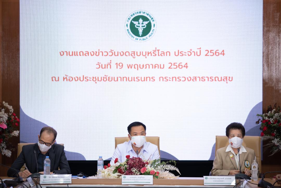ณ กระทรวงสาธารณสุข จ.นนทบุรี นายอนุทิน ชาญวีรกูล รองนายกรัฐมนตรี และรัฐมนตรีว่าการกระทรวงสาธารณสุข นพ.เกียรติภูมิ วงศ์รจิต ปลัดกระทรวงสาธารณสุข นพ.โอภาส การย์กวินพงศ์ นพ.แดเนียล เคอร์เทสซ์ ผู้แทนองค์การอนามัยโลกประจำประเทศไทย และศ.เกียรติคุณ พญ.สมศรี เผ่าสวัสดิ์ นายกแพทยสภา และประธานคณะอนุกรรมการด้านบำบัดรักษา และฟื้นฟูผู้เสพติดผลิตภัณฑ์ยาสูบ แถลงข่าวการรณรงค์เนื่องในวันงดสูบบุหรี่โลก ประจำปี 2564 พร้อมเปิดตัวสัญลักษณ์รณรงค์ภายใต้คำขวัญ “เลิกสูบ ลดเสี่ยง คุณทำได้”
