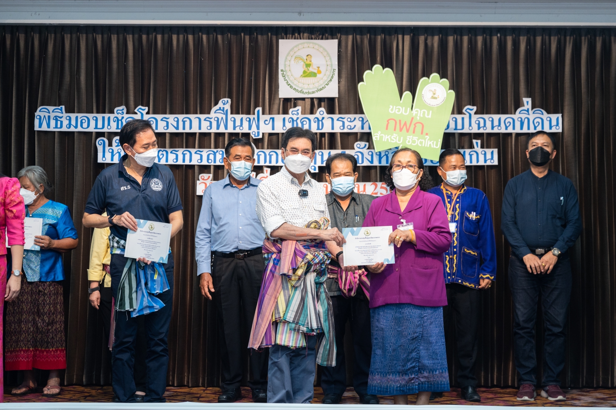 วันที่ 18 มิถุนายน ที่ราชาวดี รีสอร์ท แอนด์ โฮเทล จังหวัดขอนแก่น นายจุรินทร์ ลักษณวิศิษฏ์ รองนายกรัฐมนตรี และรัฐมนตรีว่าการกระทรวงพาณิชย์ ประธานกรรมการกองทุนฟื้นฟูและพัฒนาเกษตรกร นายสมยศ ภิราญคำ รักษาการในตำแหน่งเลขาธิการสำนักงานกองทุนฟื้นฟูและพัฒนาเกษตรกร พร้อมผู้เกี่ยวข้อง ได้ร่วมเดินสายแก้หนี้เกษตรกรภาคอีสานใน กิจกรรมมอบเช็คชำระหนี้และมอบโฉนดที่ดินคืนให้เกษตรกรสมาชิกกองทุนฟื้นฟูและพัฒนาเกษตรกร โดยในวันนี้ได้เดินทางมาที่จังหวัดขอนแก่นเพื่อมอบเช็คเงินกองทุนฯ กว่า 26 ล้านบาท พร้อมมอบโฉนดคืนอีก 18 ราย