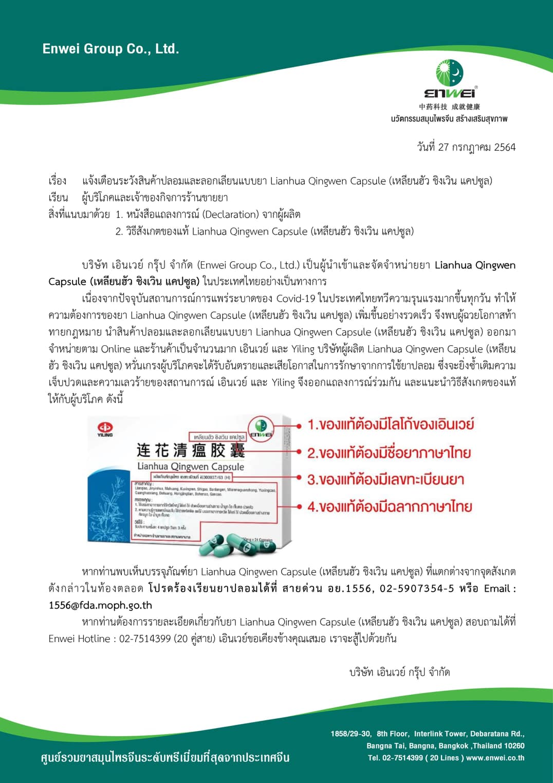 ทั้งนี้ บริษัท เอินเวย์ กรุ๊ป จำกัด เป็นผู้นำเข้าและจัดจำหน่ายยา เหลียนฮัว ชิงเวิน แคปซูล ในประเทศไทยอย่างเป็นทางการแต่เพียงผุ้เดียว โดยมีจำหน่ายเฉพาะในร้านขายยาและสถานพยาบาลเท่านั้น กฎหมายไม่อนุญาตให้ขายผลิตภัณฑ์สมุนไพรผ่านทางสื่อออนไลน์และห้ามโฆษณาผลิตภัณฑ์โดยไม่ได้รับอนุญาต ซึ่งหากผู้บริโภคสั่งซื้อผลิตภัณฑ์ดังกล่าวที่มีการลักลอบขายทางสื่อออนไลน์ เสี่ยงต่อการได้รับผลิตภัณฑ์สมุนไพร ปลอมและไม่ได้คุณภาพ และอาจได้รับอันตรายถึงแก่ชีวิตได้