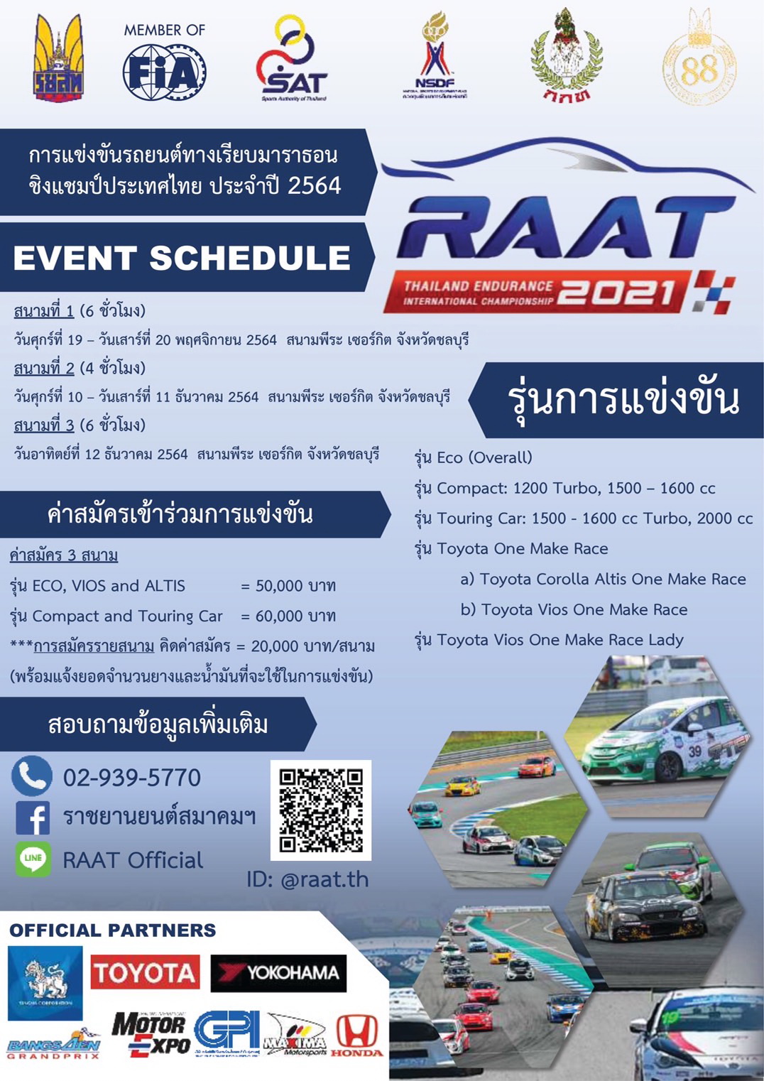 นอกจากนี้ ทางสมาคมฯได้เตรียม จัดการแข่งขันรายการยานยนต์ทางเรียบมาราธอน RAAT Thailand Endurance Championship International 2021  เพื่อสนับสนุนกีฬามอเตอร์สปอร์ตในประเทศไทย ให้เป็นที่แพร่หลายยิ่งขึ้นด้วยเช่นกัน ณ สนามพีระอินเตอร์เนชั่นแนลเซอร์กิต โดยสนามแรกจะจัดขึ้นในวันที่ 19-20 เดือนพฤศจิกายน และสนามที่ 2 วันที่ 10-11 ธันวาคม ส่วนสนามที่ 3 จัดขึ้นในวันที่ 12 ธันวาคมศกนี้ แบ่งรุ่นการแข่งขันออกเป็น 5 ประเภทหลัก ประกอบด้วย 1 รุ่น Eco (Overall) ,2 รุ่น Compact :  1200 Turbo, 1500-1600 cc, 3 รุ่น Touring Car: 1500-1600 cc Turbo,2000 cc, 4 รุ่น Toyota One Make Race และ 5 รุ่น Toyota Vios One Make Race Lady