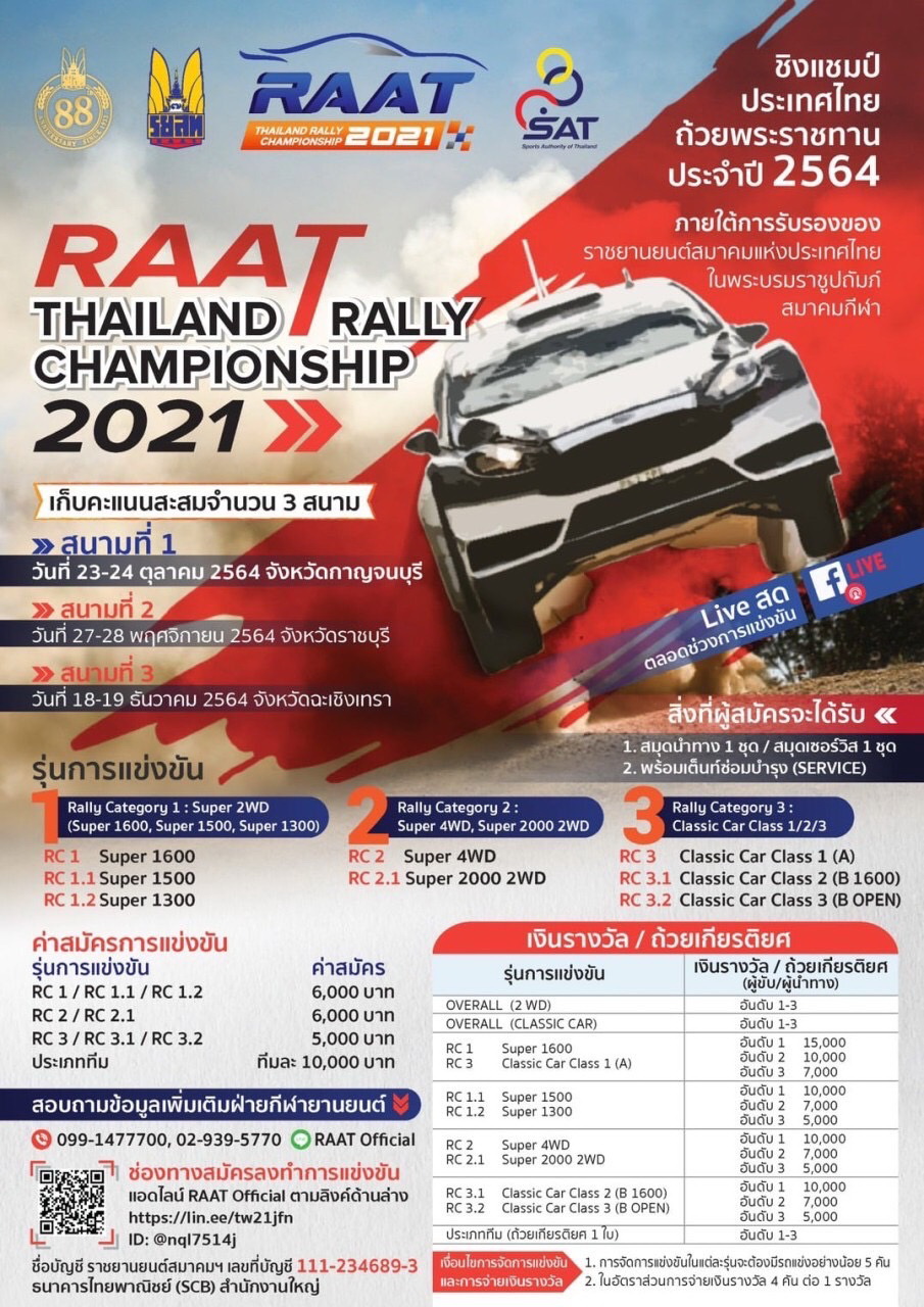 พร้อมกันนี้ ในปีนี้จะเป็นปีแรกที่ทางสมาคมฯได้เตรียมจัดการแข่งขัน แรลลี่ชิงแชมป์ประเทศไทย ในรายการ RAAT Thailand Rally Championship 2021 ชิงถ้วยพระราชทาน ซึ่งรายการดังกล่าวนี้เป็นอีกตัวอย่างของการพัฒนาวงการมอเตอร์สปอร์ตไทย ไทย โดยสมาคมฯได้นำเสนอรูปแบบการจัดแข่ง ภายใต้แนวคิดการจัดในลักษณะแรลลี่ปิด ซึ่งหมายถึงไม่ใช้ถนนสาธารณะ หรือไลน์การขับที่ไม่ไปรบกวนผู้ที่อยู่อาศัยบริเวณนั้น อีกทั้งจะต้องไม่ไปสร้างปัญหาหรือมลพิษ พอลลูชั่นให้คนท้องถิ่นนั้น ไม่ว่าจะเป็นเรื่องเสียง หรือฝุ่นก็ตาม ฉะนั้นแรลลี่ปิดจึงเป็นแนวคิดใหม่ที่จะเกิดขึ้น ทางคณะทำงานจึงได้ทำการสำรวจพื้นที่ที่มีขนาดใหญ่เพียงพอรองรับแนวคิดดังกล่าว ซึ่งมีทั้งพื้นที่ของเอกชนและหน่วยงานรัฐ โดยเบื้องต้นนั้นต้องมีระยะทางและรูปแบบที่เป็นไปตามกฎของ ร.ย.ส.ท. โดยจัดทั้งสิ้น 3 ครั้ง เริ่มสนามแรกวันที่ 23-24 เดือนตุลาคม ศกนี้ ที่ อ.บ่อพลอย จ.กาญจนบุรี  สนามที่ 2 ในวันที่ 27-28 พฤศจิกายน ที่จ.ราชบุรี และจบสนามสุดท้ายในวันที่ 18-19 ธันวาคม จ.ฉะเชิงเทรา แบ่งการแข่งขันออกเป็น 3 รุ่น ประกอบด้วย 1.Rally Category 1: Super 2WD ( Super 1600, Super 1500, Super 1300 ) , 2.Rally Category 2: Super 4WD, Super 2000 2WD และ รุ่นที่ 3 Classic Car Class 1/2/3