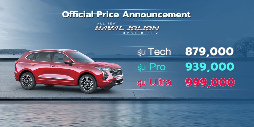 เกรท วอลล์ มอเตอร์ เปิดตัว All New HAVAL JOLION Hybrid SUV อย่างเป็นทางการในประเทศไทย พร้อมประกาศราคาของทั้ง 3 รุ่น ได้แก่ รุ่น TECH ที่ 879,000 บาท รุ่น PRO ที่ 939,000 บาท และรุ่น ULTRA ที่ 999,000 บาท โดยจะเป็นราคาแบบ “ONE PRICE” ราคาเดียวกันในทุกๆ ช่องทางจำหน่าย