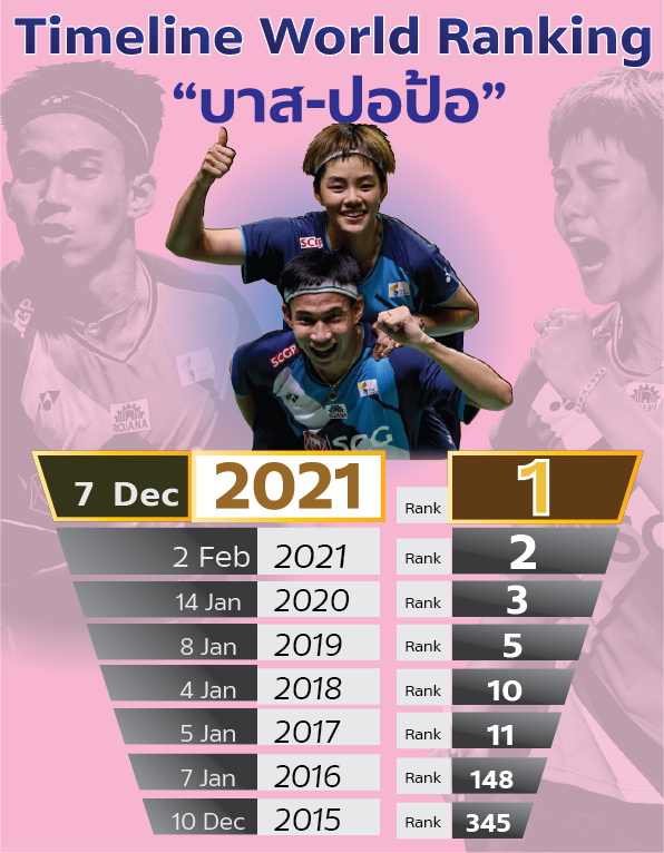 สำหรับบาสและปอป้อที่เริ่มจับคู่กันเมื่อปี ค.ศ.2015 ไต่อันดับโลกโดยเริ่มจากอันดับ 345 เมื่อวันที่ 10 ธันวาคม 2015 จากนั้นปี 2016 (7 มกราคม) อยู่อันดับ 148, ปี 2017 (5 มกราคม) อันดับ 11, ปี 2018 (4 มกราคม) อันดับ 10, ปี 2019 (8 มกราคม) อันดับ 5, ปี 2020 (14 มกราคม) อันดับ 3, ปี 2021 (2 กุมภาพันธ์) อันดับ 2 และ ปี 2021 (7 ธันวาคม) อันดับ 1