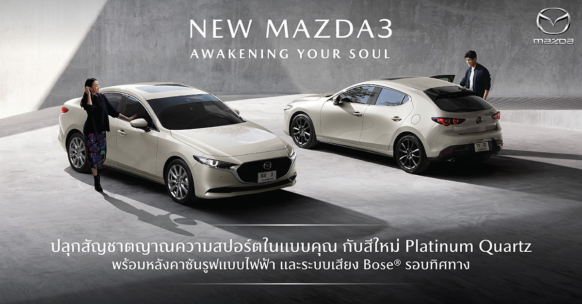 มาสด้าเดินหน้ากระตุ้นตลาดต่อเนื่อง ส่ง New Mazda3 เก๋งยอดนิยม ต้นแบบแห่งความสง่างามดุจงานศิลปะชิ้นเอก ยนตรกรรมที่พร้อมปลุกสัญชาตญาณความสปอร์ตในตัวคุณให้มีชีวิต เจ้าของรางวัลรถยนต์ออกแบบยอดเยี่ยมของโลก และ Top 3 รถยนต์ยอดเยี่ยมของโลก ชูไฮไลท์สำคัญ คือ สมรรถนะการขับขี่ที่ดีเยี่ยม ด้วยเครื่องยนต์สกายแอคทีฟเบนซิน 2.0 ลิตร และเพิ่มอุปกรณ์อำนวยความสะดวกและความปลอดภัยครบครันยิ่งขึ้นตั้งแต่รุ่นเริ่มต้น เสริมภาพลักษณ์ความสปอร์ตหรูที่เหนือกว่ากับหลังคาซันรูฟแบบไฟฟ้าหนึ่งเดียวในตลาด พร้อมเติมเต็มเอกลักษณ์ที่โดดเด่นในแบบไม่ซ้ำใครกับสีภายนอกใหม่ บรอนซ์ แพลตทินั่ม ควอตซ์ มาพร้อมตัวถังสองรูปแบบทั้งซีดานและฟาสท์แบค ที่สะท้อนภาพลักษณ์และตอบโจทย์ไลฟ์สไตล์ของผู้ขับขี่ที่ลงตัว มอบความคุ้มค่าคุ้มราคาด้วยราคาจำหน่ายเริ่มต้นเพียง 979,000 บาท พร้อมโปรโมชั่นสุดพิเศษ กับดอกเบี้ย 1.99%1 และฟรีประกันภัยชั้นหนึ่ง Mazda Premium Insurance 1 ปี2 เชิญสัมผัสตัวจริงเสียงจริงได้แล้ววันนี้ที่โชว์รูมมาสด้าทั่วประเทศ และพร้อมส่งมอบรถใหม่ให้กับลูกค้าทันที