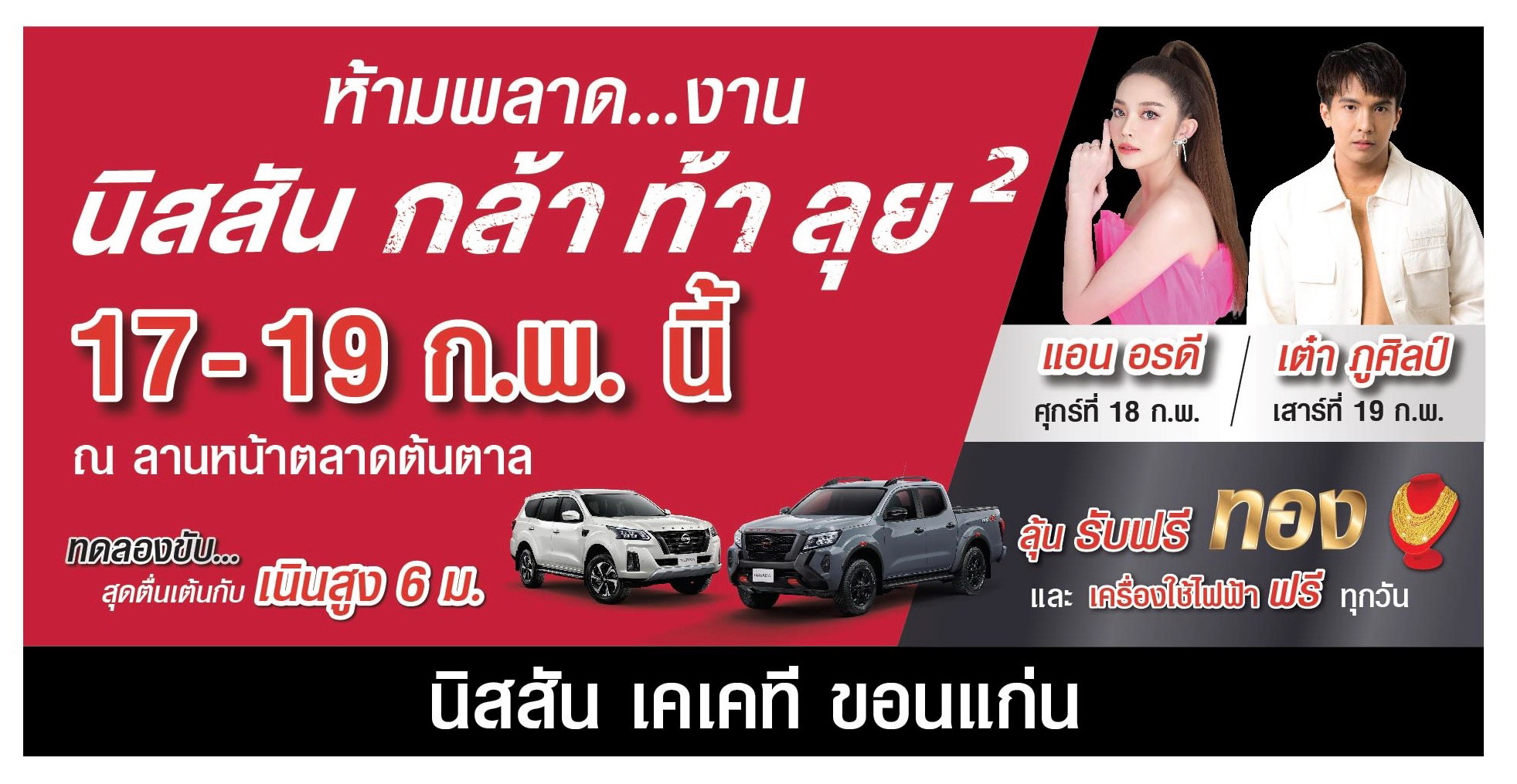 “นิสสัน กล้า ท้า ลุย ยกกำลังสอง” ยกขบวนนิสสัน นาวารา รถกระบะที่กล้าเพื่อคนแกร่ง สุด หล่อ แรง ล้ำ และ นิสสัน เทอร์ร่า ใหม่ รถเอสยูวีสำหรับทุกคนในครอบครัว สู่เมืองเสียงแคนดอกคูน จังหวัดขอนแก่นและพื้นที่ใกล้เคียง เชิญชวนร่วมกิจกรรมและทดสอบรถยนต์นิสสันรุ่นยอดนิยม ภายในงานระหว่างวันที่ 17 - 19 กุมภาพันธ์ 2565 เวลา 11.00 น. – 21.00 น. ที่ลานกิจกรรมตลาดต้นตาล จังหวัดขอนแก่น ตามรายละเอียดของกิจกรรมดังนี้