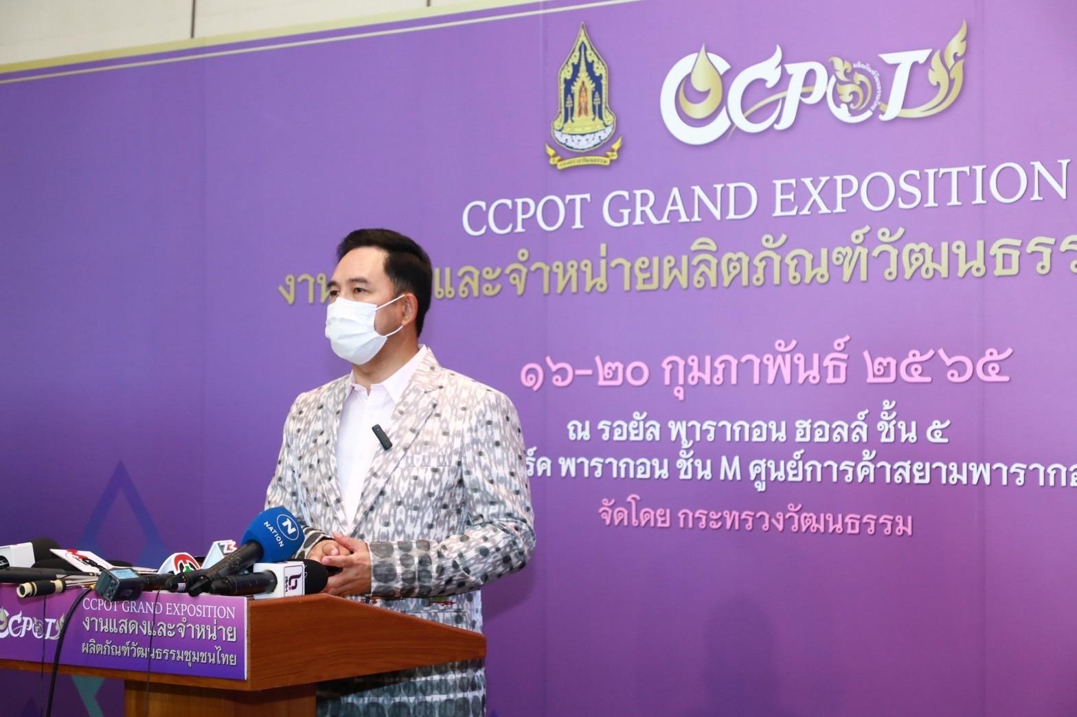 นายอิทธิพล คุณปลื้ม รัฐมนตรีว่าการกระทรวงวัฒนธรรม เปิดเผยว่า “งานแสดงและจำหน่ายผลิตภัณฑ์วัฒนธรรมชุมชนไทย CCPOT GRAND EXPOSITION ดำเนินงานภายใต้ “โครงการการกระตุ้นและส่งเสริมเศรษฐกิจฐานรากด้วยการพัฒนาผลิตภัณฑ์วัฒนธรรมชุมชนไทย (Community Cultural Product of Thailand : CCPOT) สู่สากล” ซึ่งเป็นการปรับบทบาทของกระทรวงวัฒนธรรมสู่กระทรวงสังคมกึ่งเศรษฐกิจที่มุ่งเน้นพัฒนายกระดับผลิตภัณฑ์ทางวัฒนธรรมชุมชนไทย สู่อุตสาหกรรมวัฒนธรรมและขยายตลาดสินค้าและบริการทางวัฒนธรรมทั้งในและต่างประเทศ รวมทั้งพัฒนาภูมิปัญญาท้องถิ่นให้เป็นสินทรัพย์ทางวัฒนธรรมและทรัพย์สินทางปัญญา ตามโมเดลเศรษฐกิจใหม่ BCG ซึ่งความสำคัญของงานนี้ คือการที่ผู้ประกอบการชุมชนวัฒนธรรมไทยจะได้เรียนรู้รูปแบบธุรกิจ เทคโนโลยี และนวัตกรรมใหม่ๆ ซึ่งสามารถนำไปต่อยอดและพัฒนาธุรกิจของตนได้ต่อไป แม้ที่ผ่านมาจะประสบกับอุปสรรคจากสถานการณ์การแพร่ระบาดจากโรคโควิด -19 แต่การจัดงานในครั้งนี้จะเป็นโอกาสสำคัญของผู้ประกอบการของไทยได้พบปะคู่ค้าทางธุรกิจเพื่อสร้างช่องทางการตลาดทั้งในและต่างประเทศ ตามแนวทาง ล้มแล้วลุกไว ของร่างแผนพัฒนาเศรษฐกิจและสังคมแห่งชาติ ฉบับที่ 13 ที่มุ่งเน้นการลดความเปราะบางต่อการเปลี่ยนแปลง พลิกวิกฤติเป็นโอกาสเพื่อสร้างการเติบโตที่มีคุณภาพและยั่งยืน”