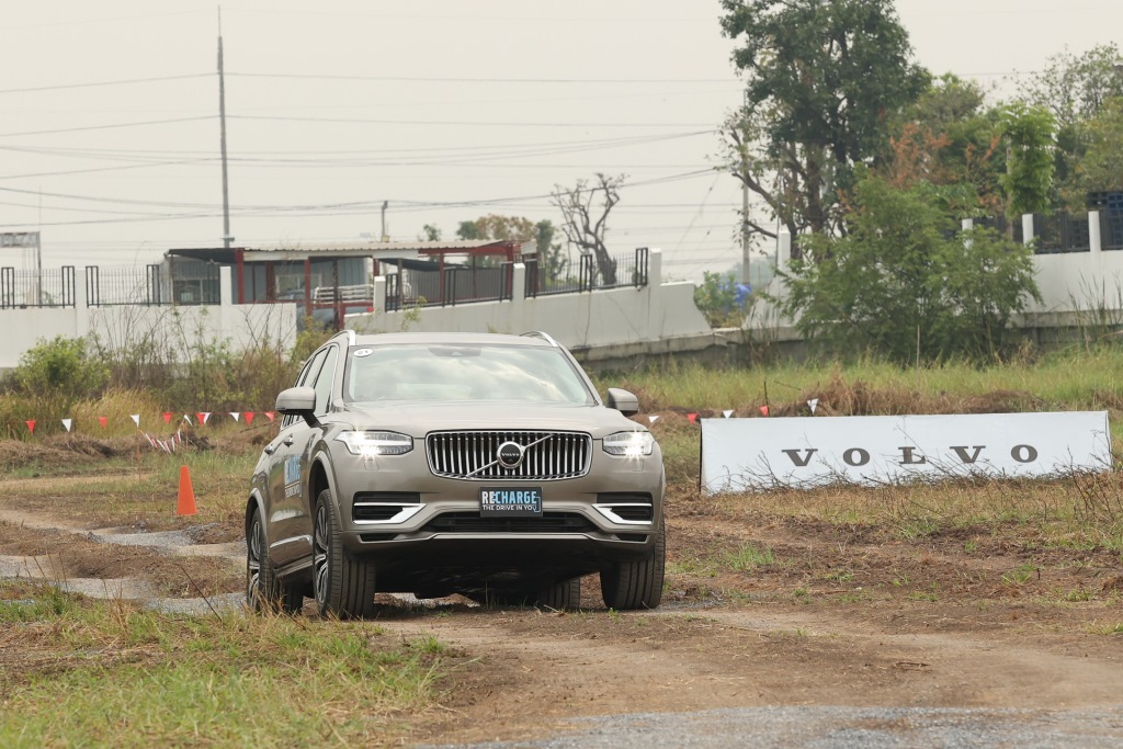 ในภาพ Volvo XC90 Recharge Plug-in Hybrid ขับขี่บนเส้นทางที่เป็นฐานเนินสูงและต่ำ สลับกันซ้ายขวาเพื่อทดสอบช่วงล่างของรถยนต์ และยังมีฐานกึ่งตะแคงเพื่อทดสอบประสิทธิภาพระบบการขับเคลื่อน 4 ล้ออันทรงพลัง