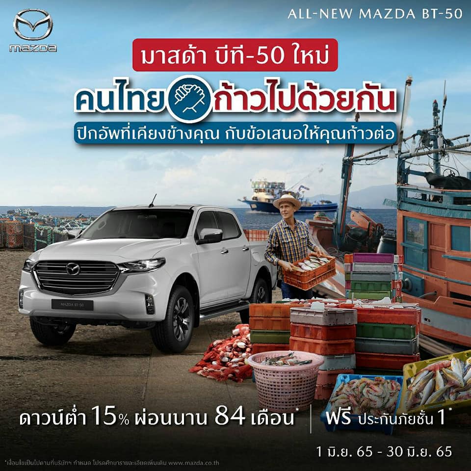 มาสด้ายังได้ส่งอีกหนึ่งแคมเปญ “มาสด้า บีที-50 ใหม่ คนไทยก้าวไปด้วยกัน” ให้กับประชาชนคนไทย ที่กำลังมองหารถปิกอัพที่ตอบโจทย์ครบครันในทุกการใช้งาน สามารถนำไปใช้ประกอบกิจการเพื่อมุ่งหน้าสู่ความสำเร็จในอีกขั้นของชีวิต ด้วยข้อเสนอเงินดาวน์ต่ำเพียง 15% ผ่อนนานสูงสุด 84 เดือน1 และฟรีประกันภัยชั้น 11 Mazda Premium Insurance ระหว่างวันที่ 1– 30 มิ.ย. 65