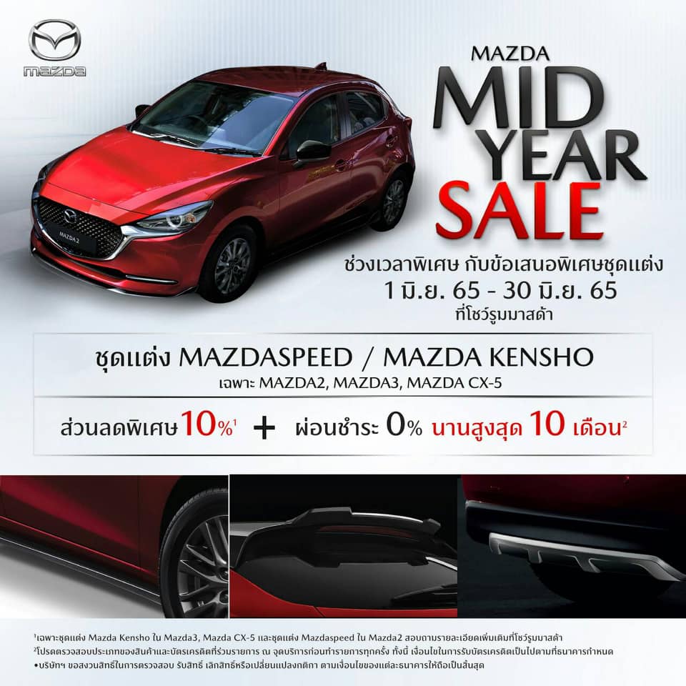 ทั้งนี้ มาสด้าได้เร่งเติมความสุขให้กับลูกค้าในช่วงกลางปี ส่งสองแคมเปญ ทั้ง “MAZDA MID YEAR SALE” ช่วงเวลาพิเศษ คว้าที่สุดแห่งข้อเสนอ ระหว่างวันที่ 11 – 19 มิถุนายน 2565 ให้กับลูกค้าที่ต้องการออกรถใหม่ ดอกเบี้ยต่ำสุด 0%1 ฟรีประกันภัยชั้น 1 Mazda Premium Insurance1 ฟรีบัตรเติมน้ำมันมูลค่าสูงสุด 15,000 บาท1 และรับฟรีของพรีเมี่ยมสุดพิเศษและข้อเสนอเอาใจคนอยากเสริมหล่อรถมาสด้าตลอดเดือนมิถุนายน 2565 รับส่วนลด 10%3 ชุดแต่งแท้ และผ่อนชำระ 0% นานสูงสุด 10 เดือน4