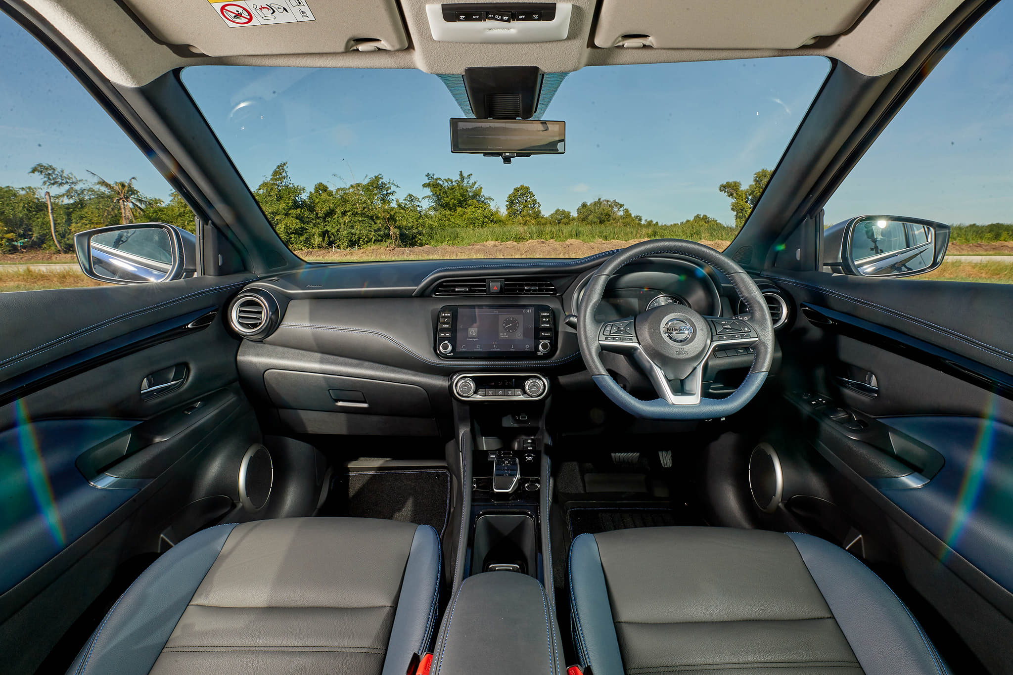 ภายในห้องโดยสาร ออกแบบด้วยโทนสีดำ ตกแต่งด้วยสีน้ำเงิน สอดคล้องกับคอนโซลหน้า ขณะที่คอนโซลกลาง ตกแต่งด้วยวัสดุหนังสังเคราะห์สีดำ เดินด้ายสีน้ำเงินที่ตัดกันอย่างลงตัว เสริมด้วยวัสดุสีดำเงา เปียโน แบล็ค ช่วยเพิ่มอารมณ์สปอร์ต สำหรับนิสสัน คิกส์ อี-พาวเวอร์ ใหม่ทุกรุ่นนั้นมาพร้อมกับพวงมาลัยหุ้มด้วยหนังแท้ และคอนโซลกลางใหม่ ที่ถูกออกแบบให้พอดีกับการตอบรับทางสรีรศาสตร์ เพื่อประสบการณ์การขับขี่สุดพรีเมียม ทำให้ดูโดดเด่นสะดุดตา พร้อมหน้าจอแสดงผลข้อมูลการขับขี่แบบ TFT อัจฉริยะขนาด 7 นิ้ว ปรับเปลี่ยนการแสดงผลได้หลายรูปแบบ และเพิ่มฟังก์ชันการแสดงสถานะไฟเบรกระหว่างใช้ระบบ อี-เพดดัล สเต็ป (e-Pedal Step) หัวเกียร์ดีไซน์ใหม่ทันสมัย ตกแต่งด้วยวัสดุสีดำ เปียโน แบล็ค พร้อมไฟตกแต่งที่ขอบ ทำให้มองเห็นชัดเจน สะดวกสบาย ง่ายต่อการใช้งาน นอกจากนี้ยังเพิ่มวัสดุบุนุ่มภายในถึง 3 จุด คือที่เท้าแขนตรงคอนโซลกลาง ขอบเบาะนั่ง และช่องเก็บของด้านหน้า ให้ผู้ขับขี่พักแขนได้อย่างสบาย ลดความเมื่อยล้าในการขับขี่ทางไกล หรือเมื่อรถติด และเพิ่มขนาดพื้นที่วางแก้วน้ำตอนหน้า 2 ตำแหน่ง ที่สามารถปรับระดับ และขนาด เพื่อรองรับแก้วทรงสูงที่มีขนาดใหญ่ และแก้วกาแฟร้อนทรงเตี้ยได้เป็นอย่างดี