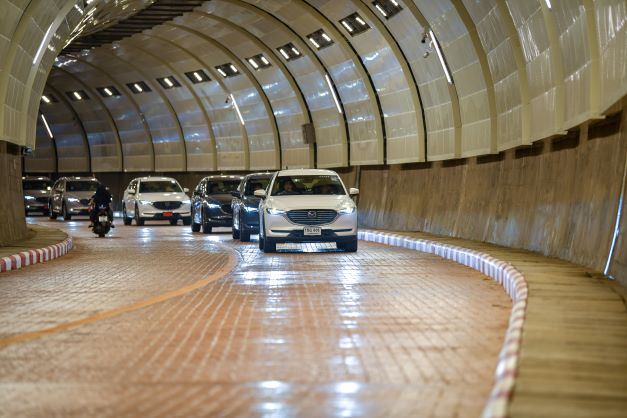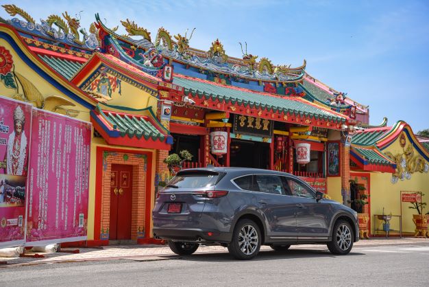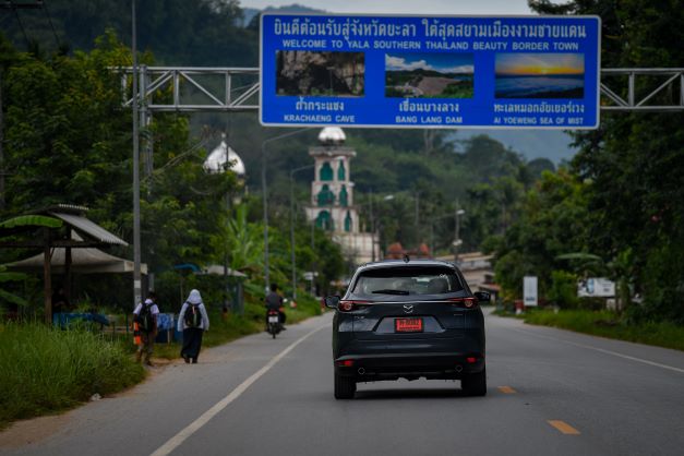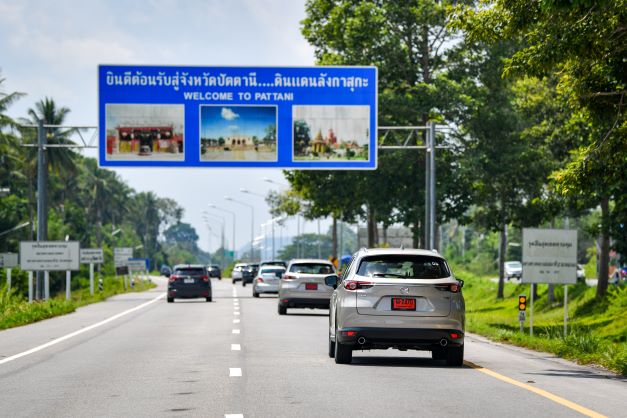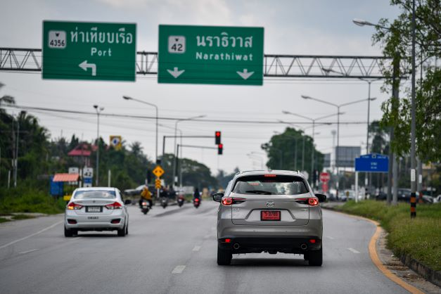 จากนั้น คาราวาน มาสด้า CX-8 ก็เริ่มขับทดสอบ โดยผมได้ขับตัวเครื่องยนต์สกายแอคทีฟเบนซิน ขนาด 2.5 ลิตร (Skyactiv-G 2.5) 194 แรงม้า แรงบิดสูงสุด 258 นิวตัน-เมตร สีแพลตทินั่ม ควอตซ์ เริ่มออกเดินทางจาก โดยมีเป้าหมายแรกที่ จังหวัดปัตตานี ออกจากตัวเมืองหาดใหญ่ ออกนอกเมือง ถนนถือว่า ดีมาก 4 เลน ทัศนียภาพยังคงเป็นเมือง หมู่บ้าน ภูเขา แต่ไม่คดเคี้ยวมากนัก ใช้ความเร็วได้พอสมควร ไปจังถึง จังหวัดปัตตานี ระยะทางประมาณ 100 กิโลเมตร