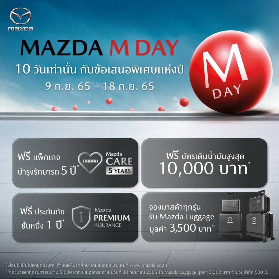 นายธีร์ กล่าวเพิ่มเติมว่าในเดือนกันยายนนี้มาสด้า ส่งแคมเปญข้อเสนอสุดพิเศษแห่งปี ต้อนรับลูกค้าที่ต้องการเข้ามาเป็นส่วนหนึ่งกับครอบครัวมาสด้า ด้วยแคมเปญ MAZDA M DAY มอบฟรีแพ็กเกจบำรุงรักษา MAZDA CARE 5 ปี* ฟรีบัตรเติมน้ำมันสูงสุด 10,000 บาท* ฟรีประกันภัยชั้นหนึ่ง Mazda Premium Insurance 1 ปี* และลูกค้า 500 ท่าน แรก ที่จองรถมาสด้าทุกรุ่นภายในงาน รับฟรี Mazda Luggage มูลค่า 3,500 บาท1 และราคาพิเศษ มาสด้า บีที-50 ใหม่ ในรุ่น FSC 1.9 C Hi-RACER ราคาเพียง 589,000 บาท และ DBL 1.9 S Hi-RACER ราคาเพียง 729,000 บาท (จำนวนจำกัด) ระหว่างวันที่ 9-18 ก.ย. 65 นอกจากนั้น มาสด้ายังมอบข้อเสนอชุดแต่งแห่งปี 65 กับส่วนลดพิเศษ 10% ชุดแต่งรอบคัน2 และผ่อนชำระ 0% นานสูงสุด 10 เดือน3 ระหว่างวันที่ 1-30 ก.ย. 65 ที่โชว์รูมมาสด้าทั่วประเทศ