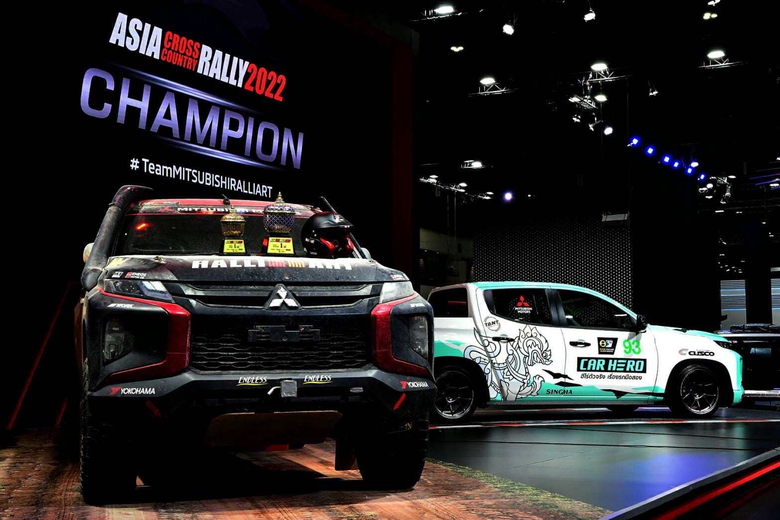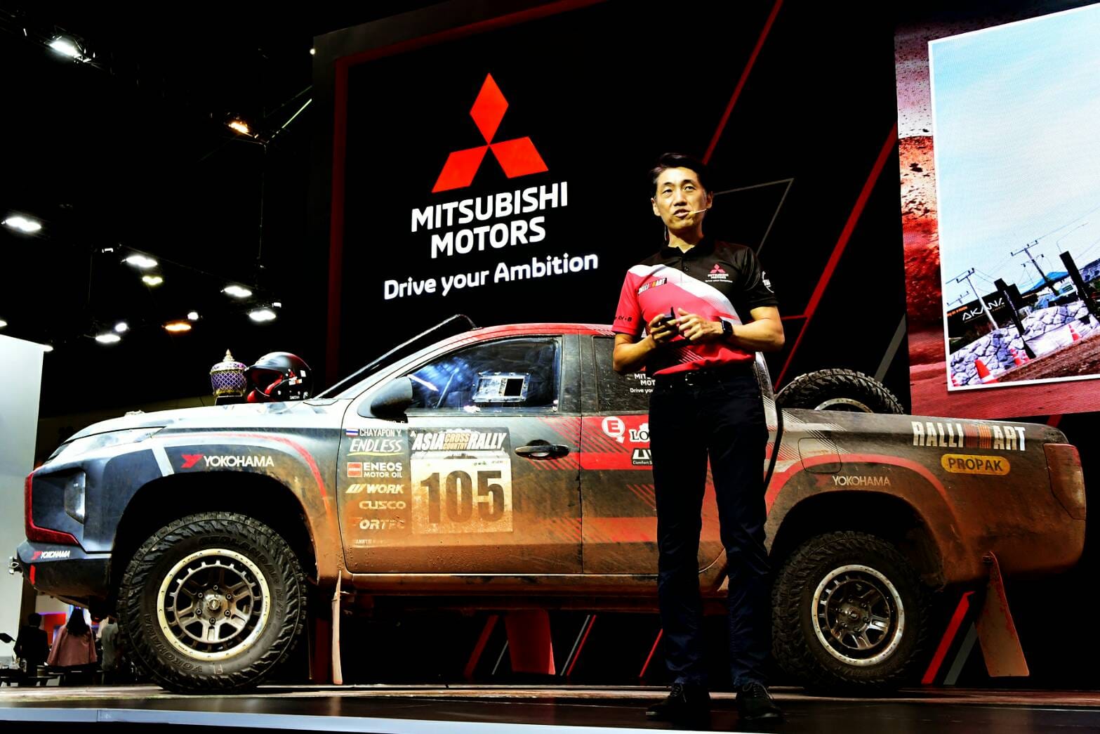 “รถไทรทัน แรลลี่คาร์ คันแชมเปี้ยนที่เพิ่งชนะการแข่งขันเอเชีย ครอสคันทรี แรลลี่ 2022 ที่จัดแสดงในงานนี้ สร้างขึ้นจากรถกระบะ มิตซูบิชิ ไทรทัน ที่ผลิตในไทย รุ่นเดียวกับที่จำหน่ายอยู่ในท้องตลาด โดยยังคงใช้เครื่องยนต์ดีเซลเทอร์โบ 2.4 ลิตร อันทรงพลัง พร้อมด้วยระบบช่วงล่างที่แข็งแกร่งของไทรทัน ที่ให้สมรรถนะการขับขี่ที่ยอดเยี่ยม มีการปรับแต่งน้อยมาก เพียงลดน้ำหนักของตัวรก และเพิ่มอุปกรณ์ด้านความปลอดภัยให้เหมาะสมกับการตะลุยสนามแข่ง จึงเรียกได้ว่า รถมิตซูบิชิ ไทรทันที่เราใช้กันอยู่ทั่วไป ก็มีสมรรถนะแข็งแกร่งทรงพลัง คล้ายคลึงกับ ไทรทัน แรลลี่คาร์ คันแชมป์เปี้ยนนี้” นายเออิอิชิ กล่าว