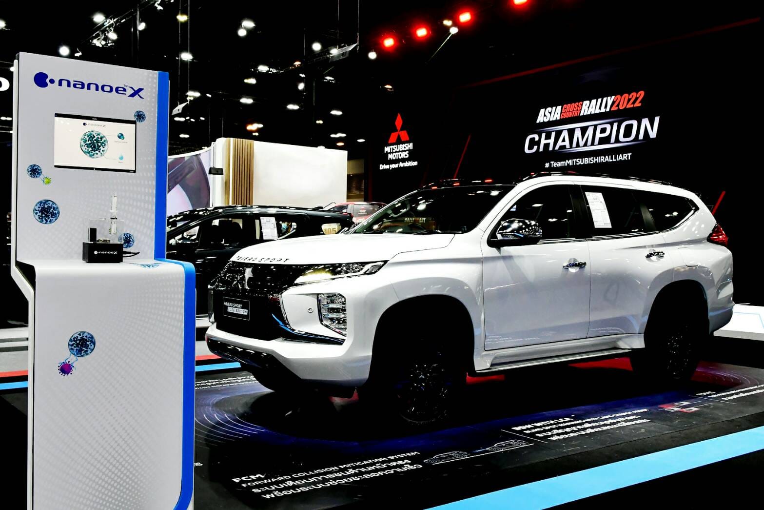 ในงานนี้ มิตซูบิชิ มอเตอร์ส ยังเปิดตัวรถยนต์มิตซูบิชิ ปาเจโร สปอร์ต ใหม่! ได้รับการยกระดับไปอีกขั้นด้วยเทคโนโลยีระบบฟอกอากาศ ที่ชื่อว่า “นาโนอีเอ็กซ์” (nanoeX) ซึ่งจะช่วยสร้างอากาศที่สะอาดและสดชื่นที่สุดภายในห้องโดยสาร เพื่อทุกคนที่คุณรัก พร้อมด้วยเบาะรองนั่งปรับไฟฟ้า ที่ออกแบบมาเพื่อให้เกิดความสบายสูงสุดสำหรับคนขับ รองรับทุกสรีระขณะขับขี่ ร่วมด้วยระบบเครื่องเสียงไดนามิคแบบพรีเมี่ยม 8 ลำโพง ที่จะทำให้คุณเพลิดเพลินไปตลอดทุกเส้นทาง มิตซูบิชิ ปาเจโร สปอร์ต ใหม่! เป็นรถอเนกประสงค์ SUV ที่โดดเด่นที่สุดทั้งในด้านความหรูหรา สมรรถนะ เทคโนโลยีด้านความปลอดภัยและความสะดวกสบายในห้องโดยสาร ขับเคลื่อนเต็มพลังด้วยเครื่องยนต์ MIVEC ดีเซล 4 สูบ DOHC ขนาด 2.4 ลิตร 181 แรงม้า ขับขี่มั่นใจในทุกสภาพถนนด้วยระบบขับเคลื่อน 4 ล้อ Super Select 4WD II อันเป็นเอกลักษณ์ของมิตซูบิชิ มอเตอร์ส และระบบเกียร์อัจฉริยะ 8 จังหวะ พร้อม Sport Mode และโหมดประหยัดเชื้อเพลิง
