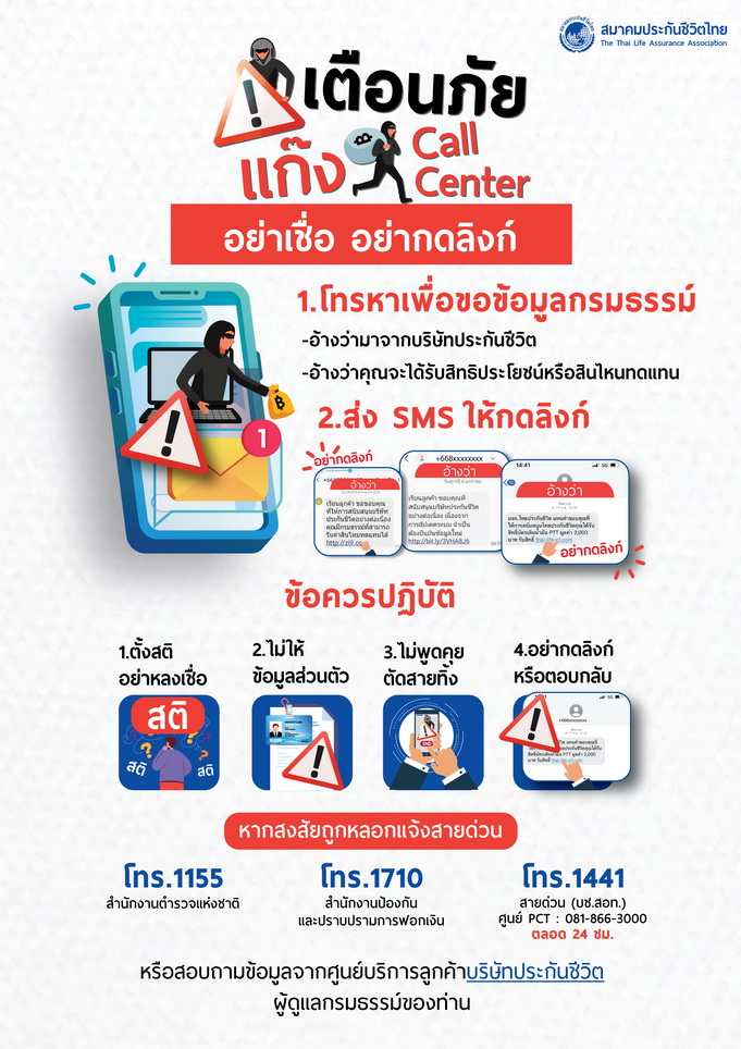 สมาคมประกันชีวิตไทย เตือนภัยกลโกงมิจฉาชีพอาชญากรรมทางเทคโนโลยีรูปแบบข้อความสั้น (SMS) แอบอ้างเป็นธนาคาร สถาบันการเงิน รวมถึงบริษัทประกันชีวิต โดยหลอกลวงเหยื่อให้กดลิงก์ที่ส่งมากับข้อความสั้น (SMS) เพื่อให้กรอกข้อมูลส่วนบุคคล ตลอดจนหลอกให้โหลดแอปพลิเคชันดูดเงิน ส่งผลกระทบให้ประชาชนสูญเสียทรัพย์สินจำนวนมาก