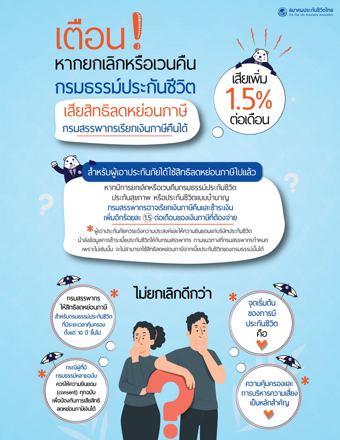 สมาคมประกันชีวิตไทย เตือนผู้เอาประกันภัยที่ใช้สิทธิลดหย่อนภาษีจากเบี้ยประกันชีวิตตามเงื่อนไขของกรมสรรพากร ต้องแจ้งความประสงค์ที่จะใช้สิทธิยกเว้นภาษีและให้ความยินยอม (Consent) แก่บริษัทประกันชีวิตนำส่งข้อมูลให้กรมสรรพากร โดยขอให้ผู้เอาประกันภัยแจ้งความประสงค์และให้ความยินยอมนำส่งข้อมูลของทุกกรมธรรม์เพื่อรักษาสิทธิประโยชน์ทางภาษี และไม่ควรยกเลิกกรมธรรม์ประกันชีวิตก่อนเกณฑ์ที่กรมสรรพากรกำหนด เนื่องจากจะทำให้ผู้เอาประกันภัยเสียสิทธิประโยชน์ทางภาษี ซึ่งรวมถึงจะต้องเสียภาษีเงินได้เพิ่มเติมของปีภาษีที่ได้ใช้สิทธิยกเว้นภาษีสำหรับเงินได้ที่จ่ายเป็นเบี้ยประกันชีวิตไปแล้ว พร้อมเงินเพิ่มร้อยละ 1.5 ต่อเดือนของเงินภาษีที่ต้องจ่าย