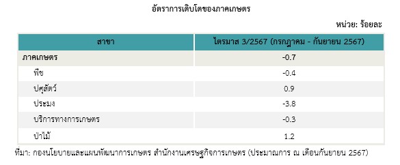 นายฉันทานนท์ วรรณเขจร เลขาธิการสำนักงานเศรษฐกิจการเกษตร (สศก.) กระทรวงเกษตรและสหกรณ์ เปิดเผยว่า ภาวะเศรษฐกิจการเกษตรในไตรมาส 3 ปี 2567 (กรกฎาคม - กันยายน 2567) หดตัวร้อยละ 0.7 เมื่อเทียบกับช่วงเดียวกันของปี 2566 โดยการผลิตสินค้าเกษตรบางส่วนในไตรมาส 3 ได้รับผลกระทบจากเอลนีโญ ส่งผลให้ปริมาณฝนน้อย และอากาศแห้งแล้ง และยังได้รับผลกระทบลานีญาที่เกิดขึ้นในเดือนกันยายน 2567 ทำให้มีมรสุมและฝนตกหนักต่อเนื่องในหลายพื้นที่ เกิดอุทกภัยน้ำป่าไหลหลากในภาคเหนือและภาคตะวันออกเฉียงเหนือ ส่งผลให้สาขาพืชและสาขาบริการทางการเกษตรยังคงหดตัวต่อเนื่องจากไตรมาส 2 เช่นเดียวกับสาขาประมง หดตัวเช่นเดียวกัน ขณะที่สาขาปศุสัตว์และสาขาป่าไม้ ยังขยายตัวได้ สำหรับรายละเอียดในแต่ละสาขา พบว่า