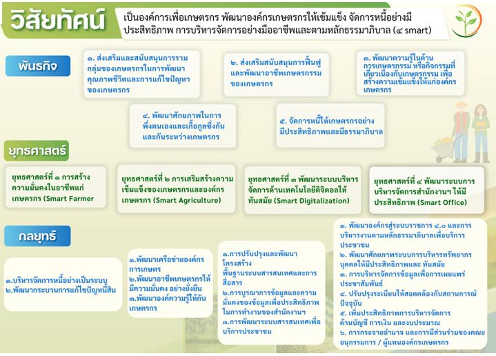 โดยการสร้างความมั่นคงในอาชีพแก่เกษตรกร (Smart Farmer) ใช้กลยุทธ์บริหารจัดการหนี้อย่างเป็นระบบ และ พัฒนากระบวนการแก้ไข้ปัญหาหนี้สิน นำไปสู่เป้าหมาย เพื่อยกระดับคุณภาพชีวิตของเกษตรกร และการบริหารจัดการหนี้อย่างเป็นระบบ ส่วนเสริมสร้างความเข็มแข็งของเกษตรกรและองค์กรเกษตรกร (Smart Agriculture)  ใช้กลยุทธ์ พัฒนาเครือข่ายองค์กรเกษตรกร พัฒนาอาชีพเกษตรกรให้มีความมั่นคงอย่างยั่งยืน และพัฒนาองค์ความรู้ให้เกษตรกร นำไปสู่เป้าหมายองค์กรเกษตรกรมีความเข้มแข็ง และเกษตรกรผลิตสินค้าราคาสูงขึ้น