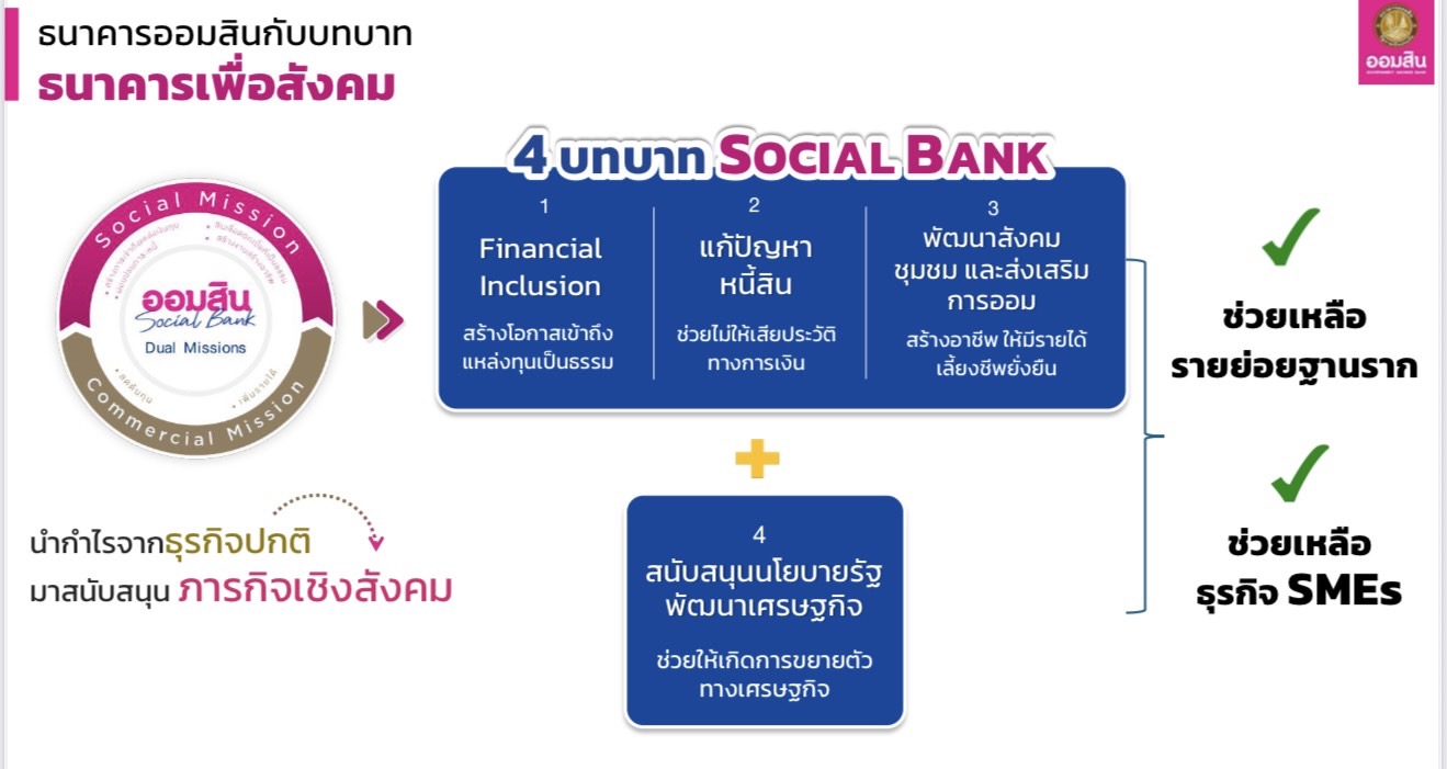 ธนาคารจะยังเดินหน้าขยายผลสร้าง Social Impact อย่างต่อเนื่อง เพื่อให้บรรลุเป้าหมายการช่วยเหลือกลุ่มเปราะบาง ปีละไม่ต่ำกว่า 2 ล้านคน ผ่าน 4 ภารกิจหลัก ควบคู่กับการบูรณาการเทคโนโลยีและนวัตกรรม AIเข้ามาช่วยยกระดับการดำเนินงานและการให้บริการทางการเงิน ไฮไลท์สำคัญ ได้แก่ “AI Optimized Loan Processing and Underwriting” ที่ช่วยเพิ่มประสิทธิภาพในการอนุมัติสินเชื่ออย่างรวดเร็วและแม่นยำ ตลอดจนลดระยะเวลาอนุมัติสินเชื่อและต้นทุนการดำเนินงาน และ “AI Chatbot for Branch” ผู้ช่วยพนักงานสาขาในการค้นหาข้อมูลอย่างสะดวก รวดเร็ว และช่วยเพิ่มความแม่นยำในการให้บริการมากขึ้น โดยจะเริ่มใช้งานในไตรมาส 4 ของปีนี้ ทั้งหมดนี้เพื่อยกระดับบริการทางการเงินให้ครบวงจร และเร่งขับเคลื่อนเศรษฐกิจฐานรากให้เติบโตอย่างมั่นคงและยั่งยืน