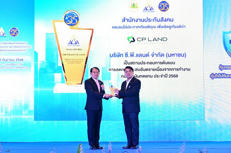 บริษัท ซี.พี.แลนด์ จำกัด (มหาชน) หรือ CP LAND ผู้นำด้านการพัฒนาอสังหาริมทรัพย์ของไทย ได้รับมอบ โล่ประกาศเกียรติคุณ สถานประกอบการต้นแบบการลดการประสบอันตรายจากการทำงาน จากสำนักงานกองทุนเงินทดแทน กระทรวงแรงงาน โดยมี คุณจักรพันธ์ ปิยะพฤกษพรรณ ผู้อำนวยการบริหาร กลุ่มงานบริการองค์กรและบริหารทรัพย์สิน CP LAND เป็นผู้แทนเข้ารับมอบรางวัลจาก คุณสุรสิทธิ์ นิธิวุฒิวรรักษ์ เลขานุการรัฐมนตรีว่าการกระทรวงแรงงาน ผู้แทนของ คุณพงศ์กวิน จึงรุ่งเรืองกิจ รัฐมนตรีว่าการกระทรวงแรงงาน