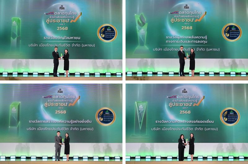 บริษัท เมืองไทยประกันชีวิต จำกัด (มหาชน) คว้า 4 รางวัล จากโครงการ “ตลาดทุนไทยร่วมใจ ส่งพลังความรู้ สู่ประชาชน เฟส 2 ปี 2568” ซึ่งจัดโดยสำนักงานคณะกรรมการกำกับหลักทรัพย์และตลาดหลักทรัพย์ (ก.ล.ต.) สะท้อนบทบาทขององค์กรในการขับเคลื่อนการพัฒนาความรู้ด้านการเงิน การประกัน และการลงทุน (Financial and Insurance Literacy) ให้แก่ประชาชนไทยอย่างเป็นรูปธรรม ภายใต้กรอบการพัฒนาที่ยั่งยืน (ESG) และความรับผิดชอบต่อสังคมในการเสริมสร้างภูมิคุ้มกันทางการเงินในระยะยาว