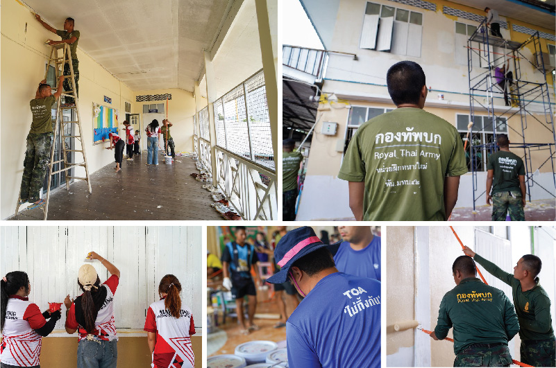 นอกจากการฟื้นฟูโรงพยาบาล TOA ยังได้ร่วมกับทหารจิตอาสา มณฑลทหารบกที่ 42 (ค่ายเสนาณรงค์) กองพลพัฒนาที่ 4 ค่ายรัตนพล นักศึกษาจากมหาวิทยาลัยสงขลานครินทร์ และมหาวิทยาลัยหาดใหญ่ ลงพื้นที่ โรงเรียนบ้านคลองหวะ (ทวีรัตนราษฎร์บำรุง) ร่วมกันทำความสะอาดและทาสีอาคารเรียนใหม่ เพื่อลบเลือนรอยคราบน้ำและฟื้นฟูบรรยากาศการเรียนรู้ที่สดใส