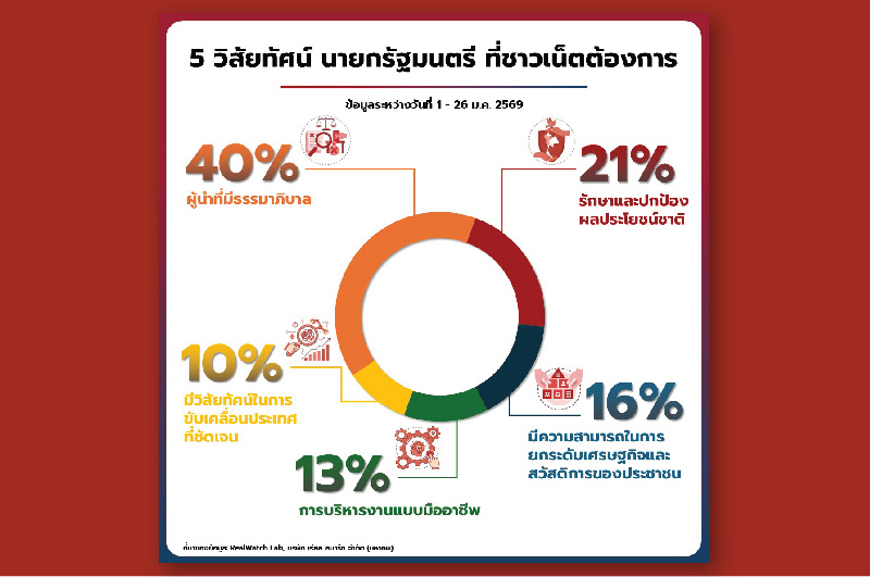 เรียลวอทช์ แล๊ป (RealWatch Lab) ส่วนวิจัยและวิเคราะห์ข้อมูล (Research and Data Analytics) บริษัท เรียล สมาร์ท จำกัด(มหาชน) บริษัท ด้าน AI-Data Driven Technology เปิดเผยถึง ผลสำรวจความเห็นของชาวเน็ต ระหว่างวันที่ 1-26 มกราคม 2569  ในทุกแพลตฟอร์ม ถึง นายกรัฐมนตรี ที่ชาวเน็ต ต้องการ จากการเลือกตั้งในวันที่ 8 กุมภาพันธ์ 2569 จำนวน 160,063 ข้อความ พบว่า 40% ของชาวเน็ต ต้องการ “นายกรัฐมนตรี ที่มีธรรมาภิบาล บริหารงานอย่างโปร่งใส ไม่ทุจริต ไม่โกงกิน”