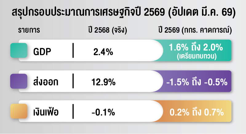 ผลกระทบทางตรงคือ ต้นทุนการขนส่งสินค้าทางเรือและอากาศพุ่งสูง ท่องเที่ยวสะดุด เที่ยวบินที่ต้องผ่านพื้นที่ขัดแย้งถูกยกเลิก กระทบรายได้หลักของประเทศ ส่งผลต่อตัวเลขที่น่ากังวล โดย สศช. ประเมินว่าหากสถานการณ์ยืดเยื้อ GDP ไทยปี 2569 อาจโตได้เพียง 1.3% - 1.6% ซึ่งต่ำกว่าเป้าหมายเดิมที่เคยมองไว้ที่ 2.0% อย่างมีนัยสำคัญ